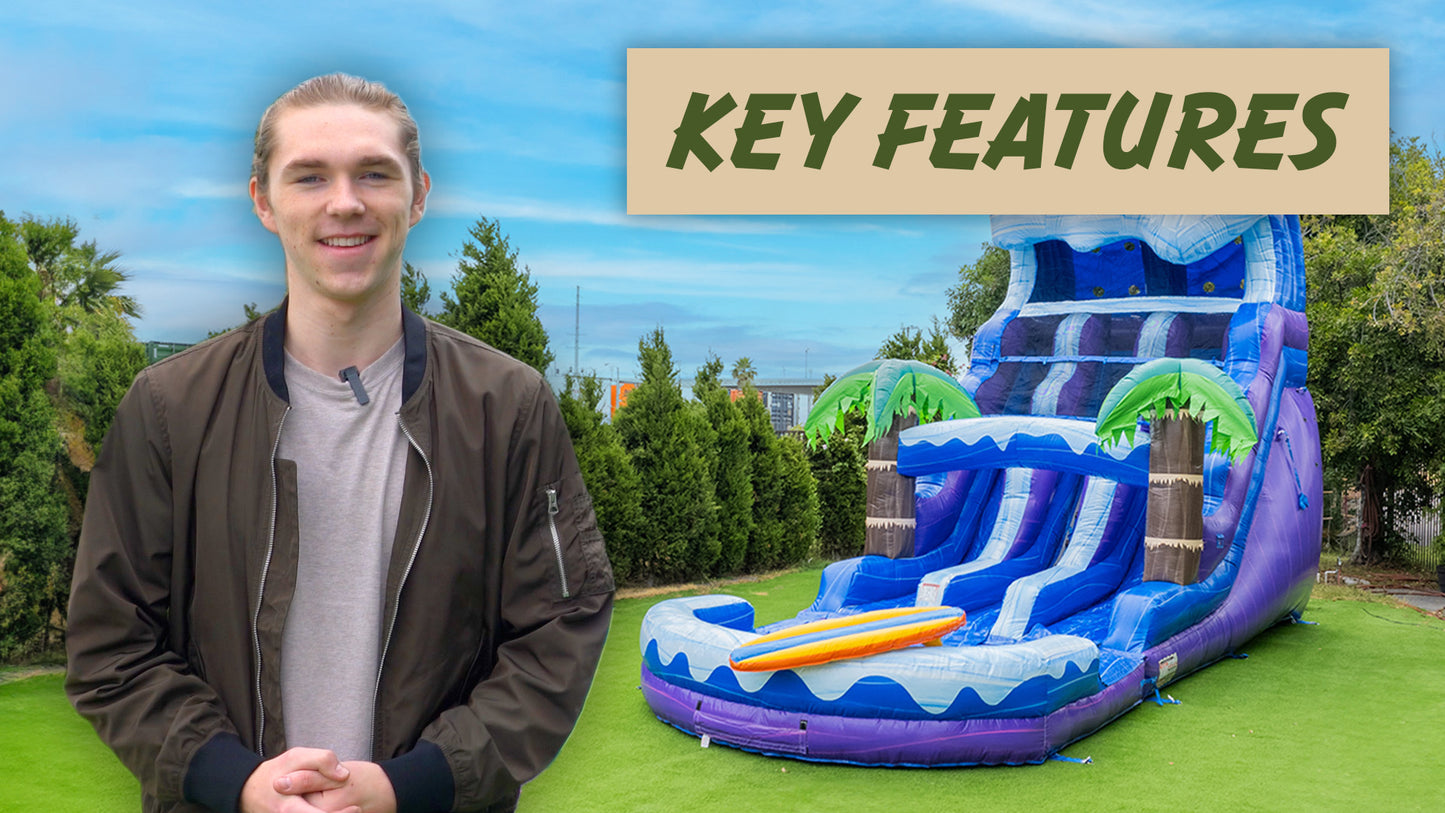 Regular price $3,279.00XJUMP 17 Tall Surf Beach Water Dual Lane Slide with a detachable deep pool! The water slide is a great way to beat the heat this summer. This inflatable dual-lane water slide is perfect for kids and will provide hours of fun on those hot sunny days. With its built-in no-jump top, the kiddos will be protected from the sun and help them slide down. Slide and get ready for some fun! Turn your home backyard into a water park in seconds.